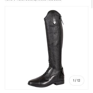 Elegant black tall riding boots with a sleek design. Perfect for equestrian activities. Size 7 MR see size chart for measurements! In very good condition my daughter worse these for less then 1 season before she outgrew them, some wear and marks as they were used in a barn with horses but very well taken care of