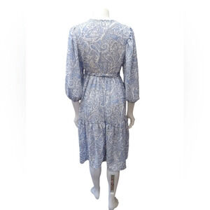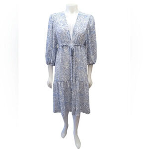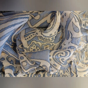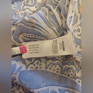 Sheer and open with matching drawstring belt, this 3/4 sleeve ties closed. Blue and white with some gold.