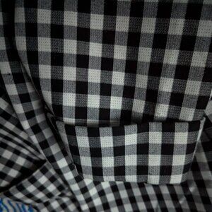 50% polyester and 50% viscose. Size Large. Fine black lining. Bottom of the sleeves is turned over. 2 front pockets. 39.5 cm sleeve length x 18.5 cm wide. Pit 48 cm. Total length of coat 96 cm. 2 snap buttons on the front.