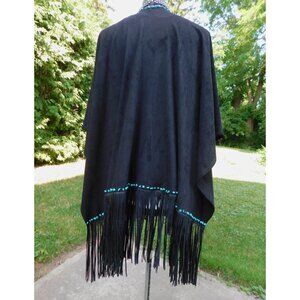 Black Thick Faux Suede and Leather Fringe Poncho with Turquoise Stone Beads O/S