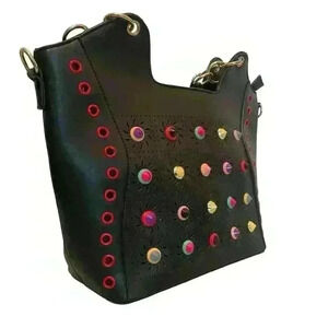 Black Tote Bag Faux Leather Colorful Studs & Gold Grommet Details, Large & Stylish