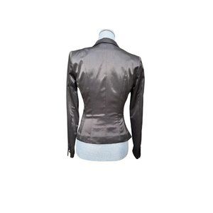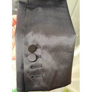 Tapered, slim-fit blazer. Black fabric with a sheen to it, peak lapel with pic-stitching. Chain link front button, working pockets, 4 working covered buttons on the cuffs. I'm selling because I've gained weight. In excellent condition, I only wore this a few times at most.