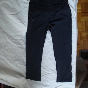 3/4 length workout tights . Material is dri-fit silky smooth. Flattering detail on the outside of the cuff and ruffling/ruching in the waistband. The cuff of these pants ends between my knee and ankle and the waistband sits just above my belly button. I am 5'3". Tag has been cut off but these should be a small. In very good condition.