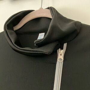 AI description:This black utility jacket features a modern design with a high collar and sleek lines, making it a versatile addition to any wardrobe. Crafted from smooth, performance fabric, it offers both style and functionality. Ideal for casual outings or athletic activities, this jacket ensures comfort and a contemporary look.