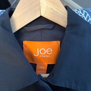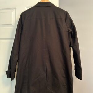 Functional meets fashion in this sleek black utility overcoat. Designed with a mid-thigh length for added coverage and structure, it features two deep front pockets and two discreet side pockets—perfect for carrying essentials. A modern, versatile piece that layers effortlessly over any outfit. Gently worn and in great condition.