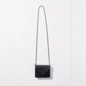 Mini wallet on a crossbody chain strap for easy on-the-go. Snap top with space for cards and cash inside.
