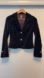 Chic black velvet blazer with unique embellished buttons and lace at the end of sleeves, made of 100% cotton, burgundy inside.