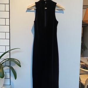 She's all stretch, very sexy black velvet fitted body con dress. Theres a single button on the back of the neck with a slight opening down the back.