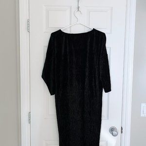 Loose-fitting black velvet dress with cropped sleeves from a small Calgary boutique. Hits mid-length (a few inches above the knee). Fabric is ribbed and stretchy. High round neck (hits just below the collar bone).