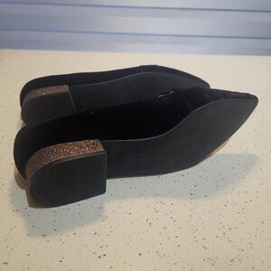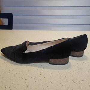 Cole Haan Marlee Skimmer flat black velvet loafers have a shimmery heel and a pointy toe.