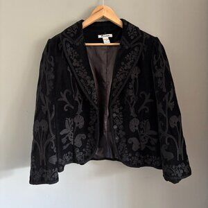 Ornate embroidery over black velvet. Beautiful construction. Very slightly gathered puffy shoulders.