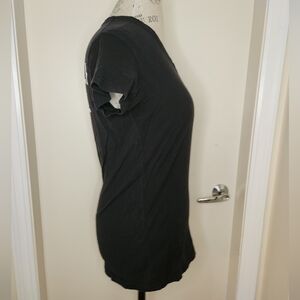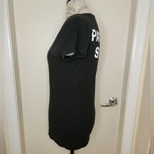 Black preshrunk Cotton Vneck short sleeve tshirt with "Patchouli Stinks" Graphic Print on the back in white block lettering.