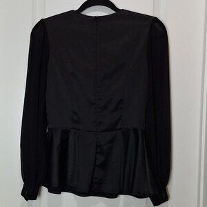 Black long-sleeved Voodoo Vixen blouse with peplum hem and keyhole neckline with large bow. Buttons at wrists and hidden zipper at back.