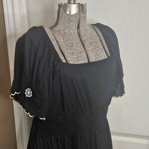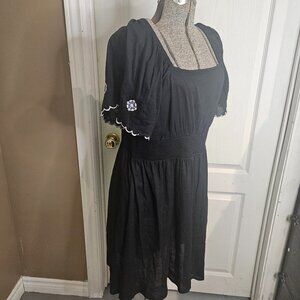 Old Navy mini dress. Black with embroidered detail on sleeves. Hits above knee. Elasticized waist and square neckline. Flounce sleeves. Very lightweight. Linen/Rayon blend. Fit and flare style.