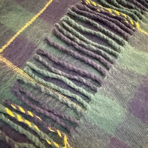 This beautiful reversible scarf features a rich Black Watch tartan wool face paired with a deep burgundy printed satin backing for a striking, elegant contrast. The wool side is soft, warm, and cozy, while the silky satin side adds a smooth, dressy touch that elevates any fall or winter outfit. At 56" long with generous fringe, it drapes nicely whether wrapped, looped, or worn loose.