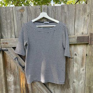 Vintage inspired B&W checked top. Sleeves reach to top of elbows. Boat neck. High contrast. Pit to pit is 18". Size and material tag is no longer on garment. This is likely a polyester blend. No stains. Great condition! Please note that this is not from the major retail store, Zara but the label reads 'Zara Trafaluc'.