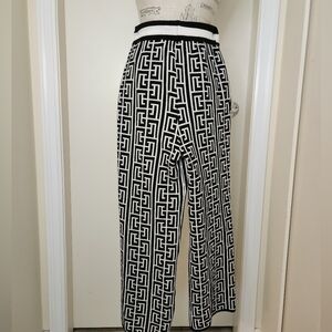 Monochrome Black & White Greek Key Highwaist Wide Leg Knit Pants with Contrasting Stripes on stretch waist and faux pockets.
