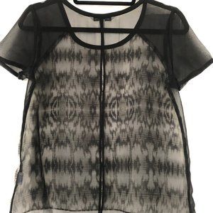 Black, white and grey tribal with peek-a-boo back detailing. The shirt is slightly see-through, made of sheer material, but can work perfectly in an office setting with a simple camisole underneath. Size XS but fits like a S