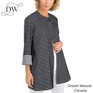 With a shift fit and gingham print, this Joseph Ribkoff designed coat has cropped full-length sleeves as well as a rounded neckline and oversized button at the top.