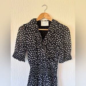 Les Coyotes De Paris Black and White Micro Dot Leopard Print Ruffle Puff Sleeve Mini Bohemian Boho Dress