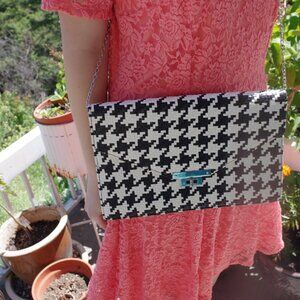Black and white clutch purse by ,13 1/2 inches wide .In very good condition. Big with chain handle.