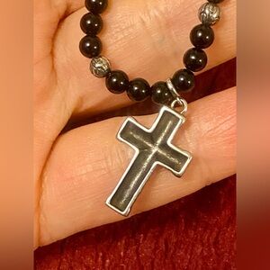 Elegant black and silver beaded bracelet featuring a cross pendant. Perfect for adding a touch of sophistication to any outfit.