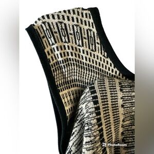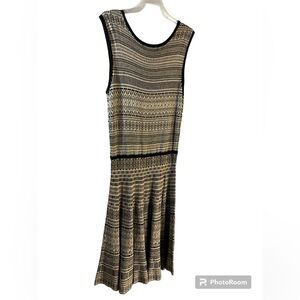 Stylish sleeveless dress with a black and beige pattern. Perfect for casual or formal occasions.