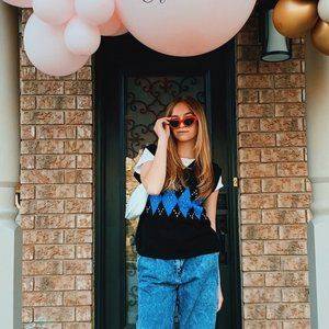 Never been worn before black and blue checkered knit sweater vest. Perfect for the spring weather! This style is so in right now. Can be paired with a white t-shirt underneath, or worn by itself. Can also be paired with a turtle neck or long-sleeve in the wintertime. Styling can be seen on the model.