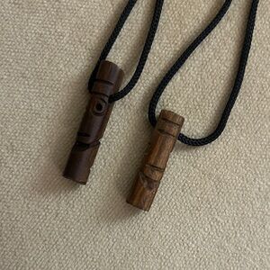 2 Stylish black necklaces with brown wooden pendants. Perfect for adding a touch of elegance to any outfit.