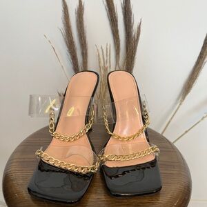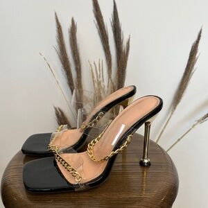 Step out in style with these chic black and clear heels. Featuring elegant chain straps, they add a touch of glamour to any outfit.