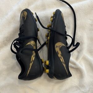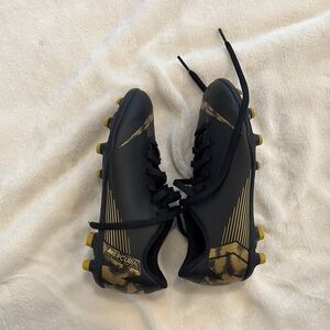 Stylish black athletic shoes with gold accents. Perfect for sports and casual wear.