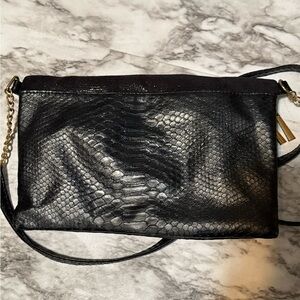 This chic crossbody bag features a striking black and gold color scheme, complemented by a textured faux leather snakeskin pattern. Its envelope-style design and gold-toned hardware add a touch of elegance, making it a versatile accessory for any occasion.