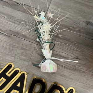 Celebrate with this stylish black and gold graduation decoration set. Includes a banner, ball, balloon weight, gold table cloth, and tassel garland.