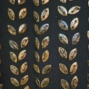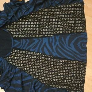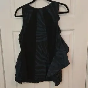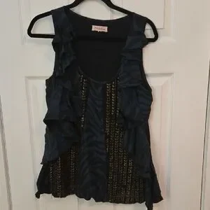 Elevate your style with the zebra stripped Black and Blue with bronze leafy beaded Ruffle Top. This chic top features elegant ruffles and a striking pattern, perfect for any occasion.