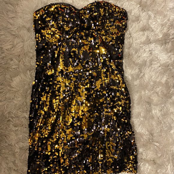 Super fun black and gold strapless sequin dress with sweetheart neckline by Pam Chorley Fashion Crimes in Toronto. Never worn in perfect condition.