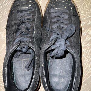 PUMA - Black and gold snakeskin pattern in suede material with brown rubber bottoms. Gold detailing and black laces, brown rubber sole is very comfortable and sturdy and makes for a well structured shoe. Have only been worn a handful of times and the shoes were kept very clean and maintained well. Size is an 8 and runs true to size.