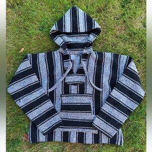 Baja hoodie, striped hoodie, black and grey, boho style, casual wear, cozy hoodie, festival fashion, unisex hoodie, streetwear, vintage vibe, comfortable fit, lightweight hoodie, layering piece, trendy hoodie, relaxed style, warm and soft, Poshmark seller, casual outfit, laid-back look, Southwestern style