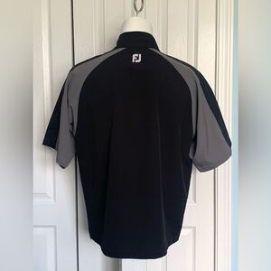 Stylish black and gray quarter-zip pullover. Features short sleeves and a sleek design.