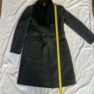 This coat is barely-worn, clean, excellent condition. In fact, the black side pockets are still sewn shut. The wool/alpaca blend is beautifully soft, and the coat truly is reversible, with the tags in the pocket, with just a small rectangular leather strip on the back of the collar, on both sides, with the Mackage logo. This is looks like an older version of the Norita 2-in-1 wrap coat, as it has one set of double-breasted buttons, as well as the tie front.