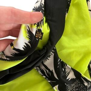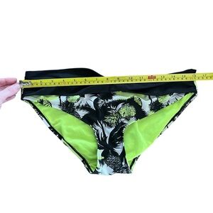 Vibrant and playful bikini bottoms featuring a bold tropical pineapple and palm tree print in black, white, and neon yellow. Smooth black ruched waistband adds a flattering touch with a modern twist. Full coverage back and lined interior for comfort. Approx. flat waist: 15”.