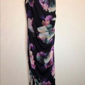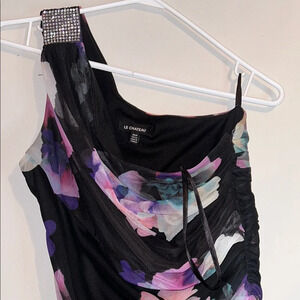 This striking bodycon dress features a chic one-shoulder design and an asymmetrical neckline, perfect for a cocktail night out. The dress showcases a captivating blend of black and pink hues, adding a touch of elegance to its form-fitting silhouette. Crafted with a silky sheen, it exudes sophistication and style.