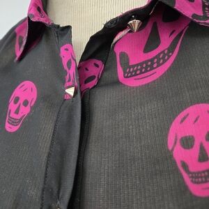 Black and Pink Sheer Skull Blouse with Studded Silver Buttons. Size Small