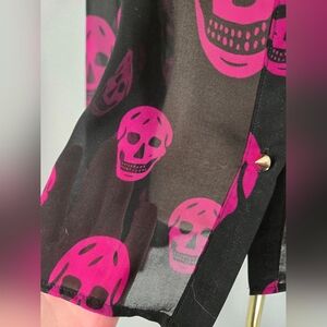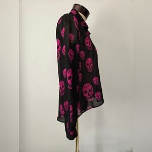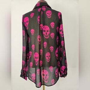 Sheer blouse with bold pink skull pattern. Studded button-up front with collar. Hi-Lo hem.