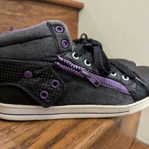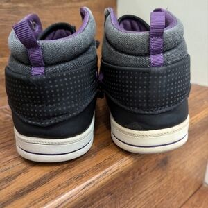 These high-top sneakers feature a vegan black leather body with purple accents, a padded purple tongue, and a white rubber sole for contrast. In good clean condition with mild wear to the body and outsole, non removable Insoles have some slip at the heel. The insoles remain intact and clean. These have lots of life left