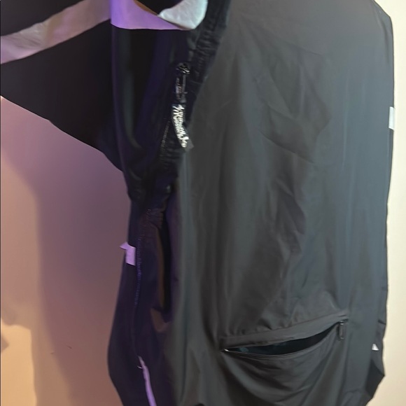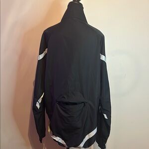 This performance jacket combines style and safety with its reflective stripes on a sleek black and silver design. Crafted from durable synthetic material, it features a high collar and elastic cuffs for a snug fit during outdoor activities.