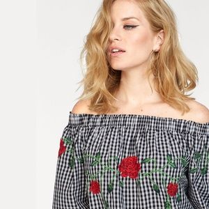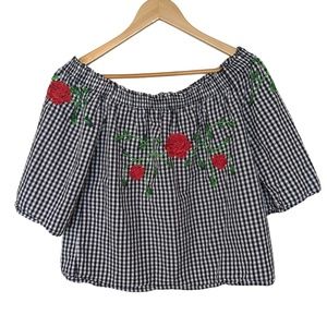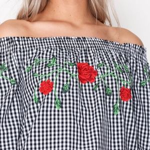 Black and White Checkered Gingham Rose Embroidered Off the Shoulder Top