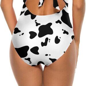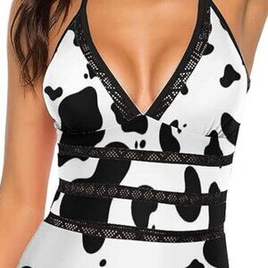 Black and White Cow Print One Piece Swimsuits for Women High Waist Adjustable Straps Bathing Suit