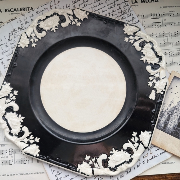 Elegant black and white decorative plate with intricate floral details. Perfect for display or serving.