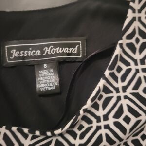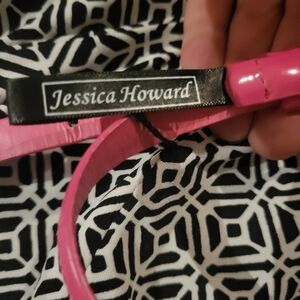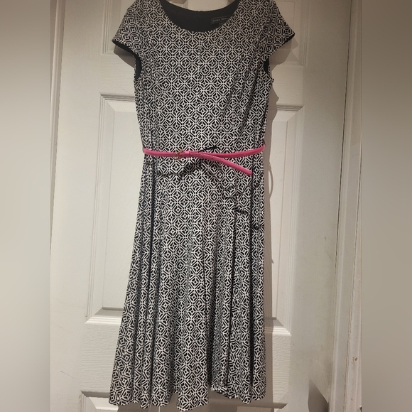 Stylish black and white geometric dress featuring a vibrant pink belt. Perfect for any occasion.