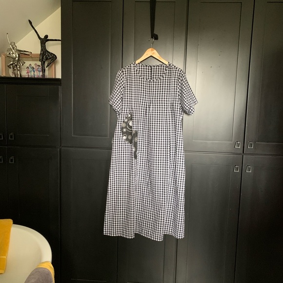 Charming black and white gingham dress featuring an abstract design. Perfect for casual outings. Pockets. In excellent condition.